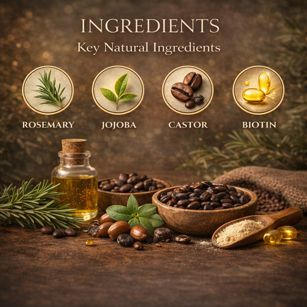 Coconut Oil, Eucalyptus, Jojoba Oil, Castor Oil, Rosemary, Biotin